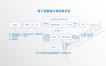 射频光纤传输(RFoF)以及数字通信系统(Digital communications)是目前较为常用的通信形式,适合于低频~+400Gbps传输应用,具有很大的市场潜力。目前市面上RFoF系统,有直接调制激光器(Directly modulated lasers)、电吸收调制器(Electro-absorption modulator)、铌酸锂外调制器(Lithium Niobate Mach-Zehnder Modulator)设计方式,相对于直接调制、电吸收调制器较容易收到带宽、消光比性能限制,铌酸锂外调制器方式具有无可比拟的高带宽、低插损、高线性等优势。