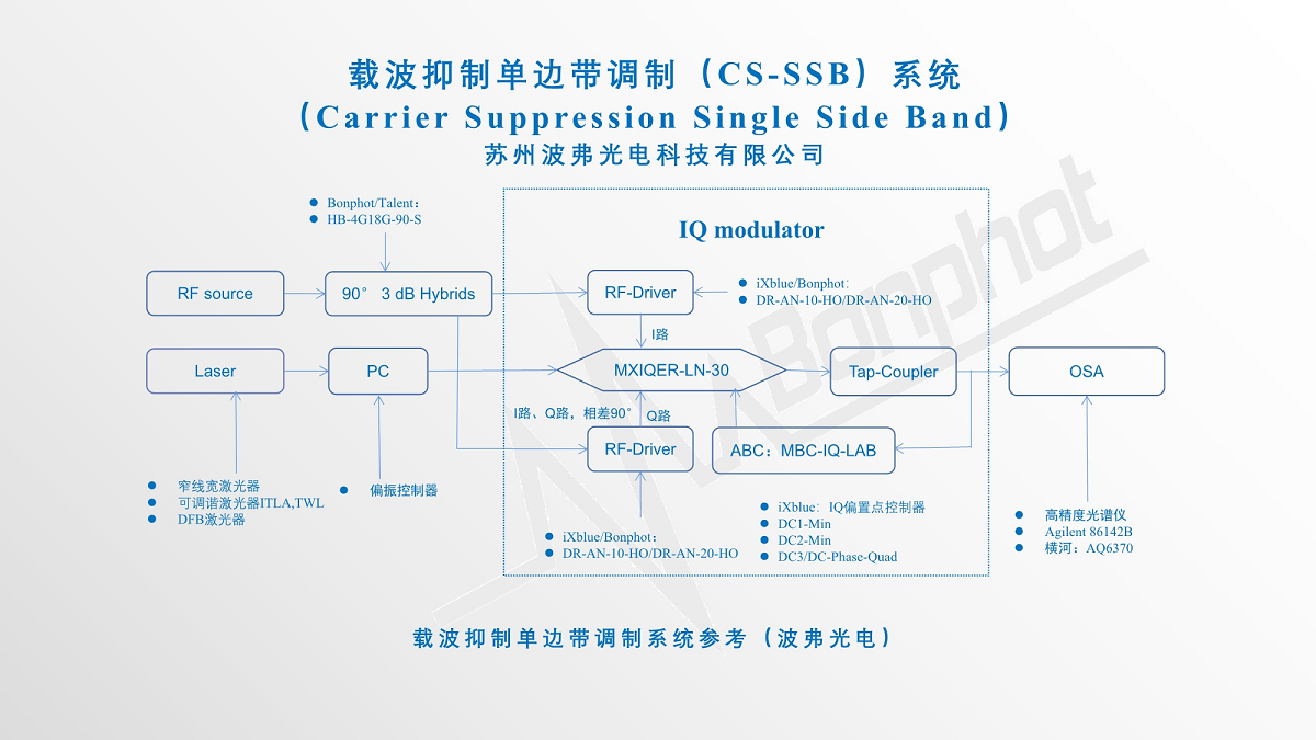 目前苏州mksport体育光电科技有限公司提供的基于法国iXblue公司的高消光比IQ调制器(MXIQER)、配合我们提供的驱动(DR-AN-10-HO/DR-AN-20-HO)以及偏置控制器(MBC-IQ-LAB-A1),可以实现>30dB(1000:1)载波抑制比,具有无可比拟的性能及优势。
