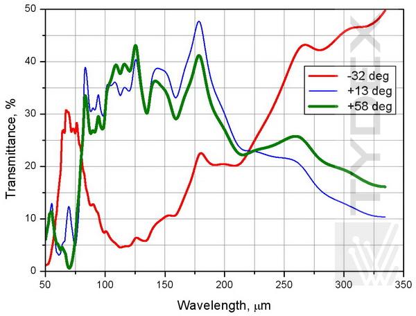 2. TWPC作为150-300μm范围内任意波长的四分之一波长单色板。TWPC操作在220 μm的四分之一波片模式下进行了测试。 图2显示了在下游偏振器的不同方向上计算和测量的TWPC透射光谱的比较。