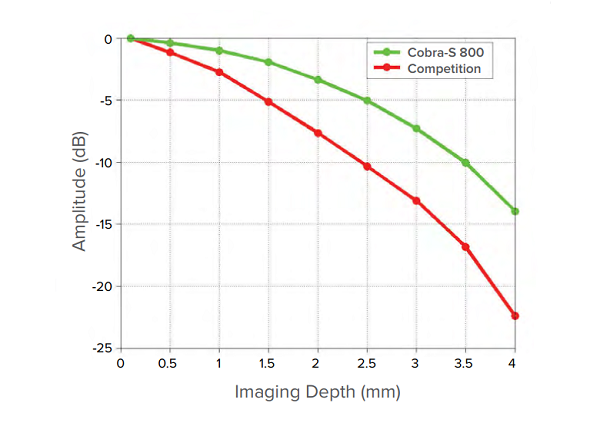 与我们的旗舰产品 Cobra-S 800 一样,Cobra OEM OCT 光谱仪提供卓越的滚降性能,从信号与成像深度的比较中可以看出。 由于滚降更少,可以比典型的 800 nm 成像更清晰地成像更深的结构。