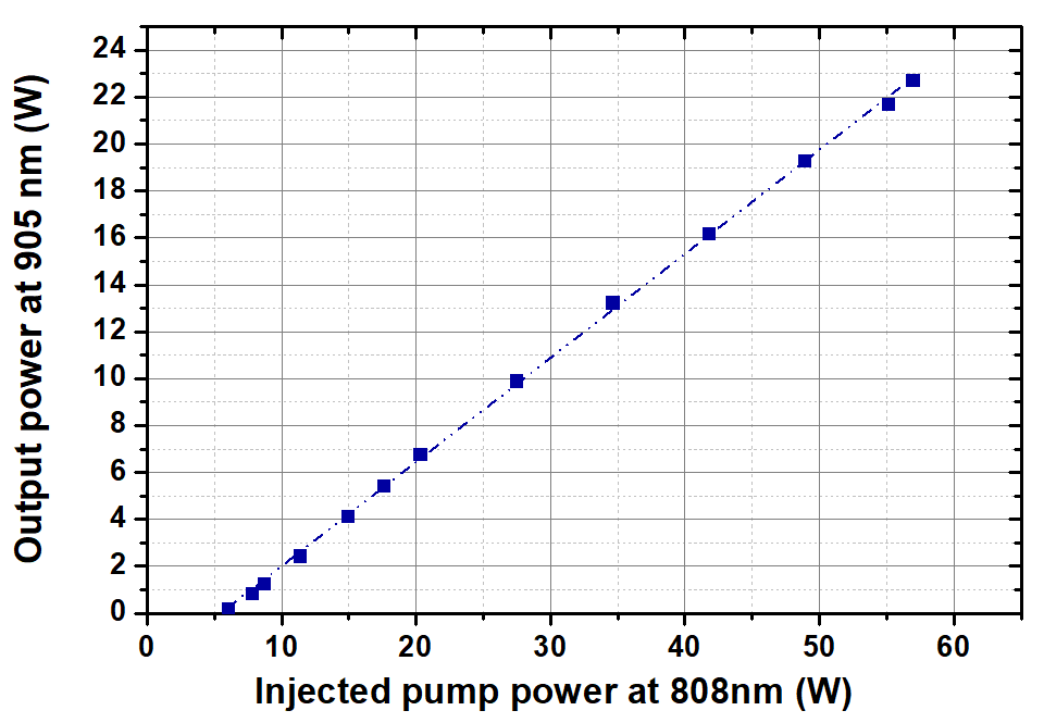 IXF-2CF-Nd-PM-30-130光纤用于放大器配置,以增加905 nm脉冲激光,在40 kHz的重复率下实现高达24 W的平均功率,脉冲持续时间为45 ns。采用倍频技术,在452nm处达到4.9W,在226nm处达到0.5W。
